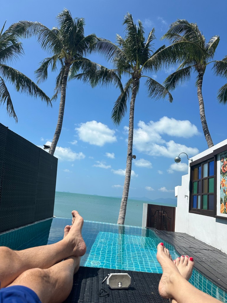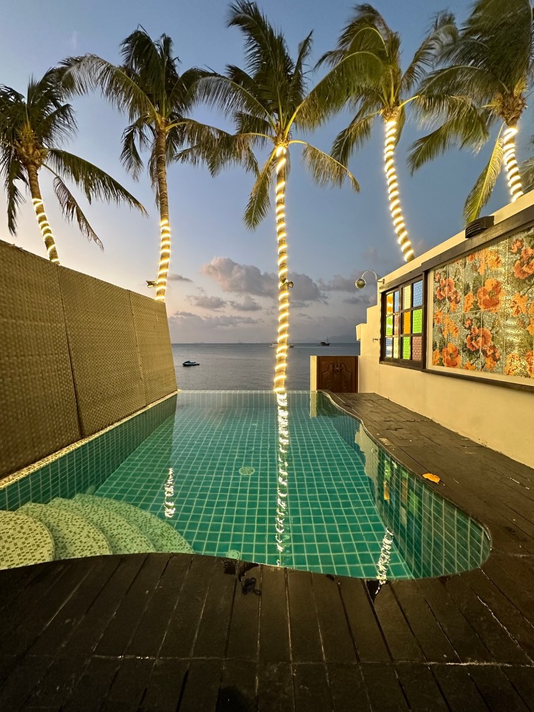 We arrived here Sunday around noon and checked into our boutique hotel, The Privilege Hotel Ezra Beach Club. The hotel is located in Ban Bang Rak area of Koh Samui. We have our own private pool in our beach front room. We also have a pond, actually it is the Gulf of Thailand.