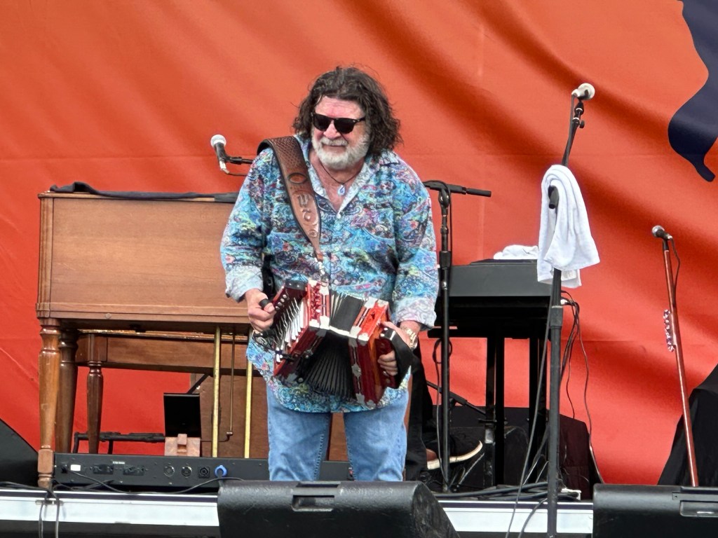 In the Blues Tent, we saw one of our Jazz Fest favorites, Sunpie & The Louisiana Sunspots. We saw Sunpie perform at the first Jazz Fest we attended three decades ago. In fact, I have a shirt (with plenty of holes in it from wearing it so often) that includes him at (was then) the Fourth Blues Harmonica Blow Out at the Rock N Bowl. Last year, Jane and I saw Sunpie perform at the New Orleans Jazz Museum for a recording of the NPR show American Roots. After the show, we talked with Sunpie and I told him that he is our favorite discovery of Jazz Fest. We turned Ronna into a Sunpie fan years ago and she was excited to see him as well.