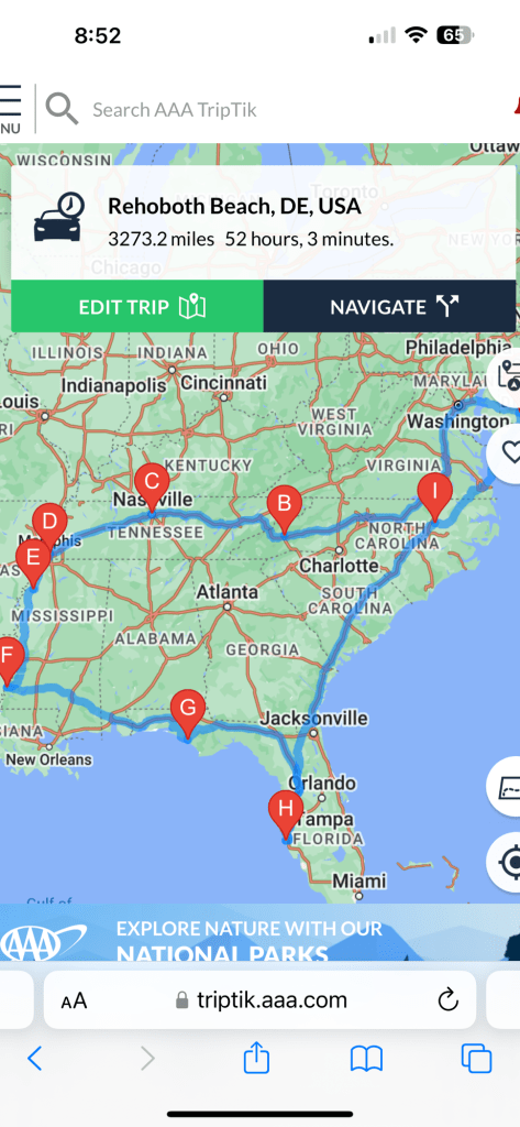 After three weeks on our road trip, we are home. We traveled 3,634 miles and we visited Asheville, Nashville, Memphis, Clarksdale, Natchez, New Orleans, Panama City, and Sarasota.