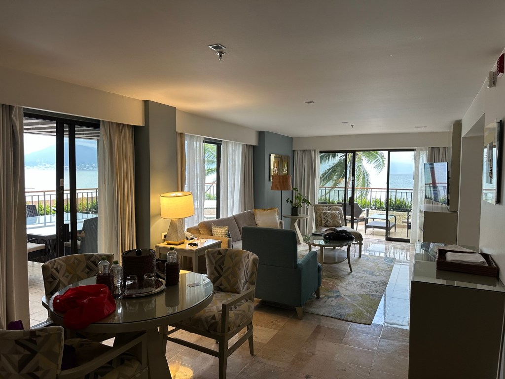 We flew into PV on Sunday afternoon. Upon our arrival at the Marriott Puerto Vallarta, we were informed that we had an upgrade to the Ambassador Suite. This is the second best room on the property other than the Presidential Suite. It was great receiving the upgrade, especially since we were here for four nights. Being Marriott Titanium level truly paid off plus it gave us a room to watch the election results on Tuesday night.