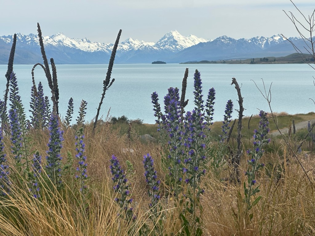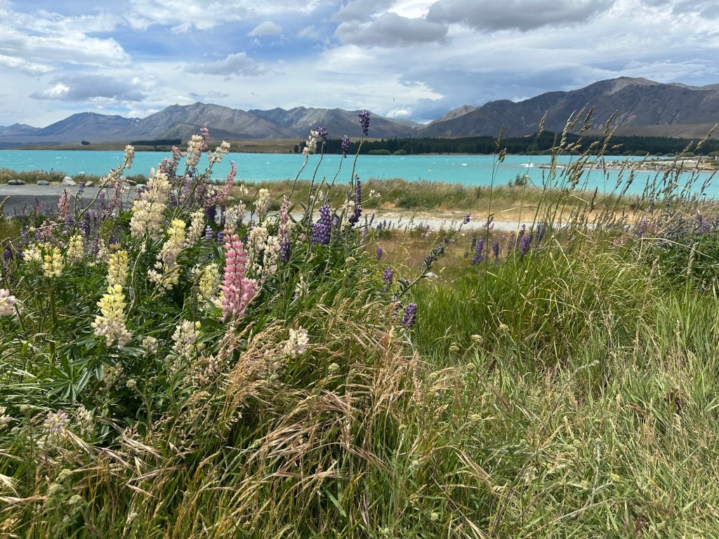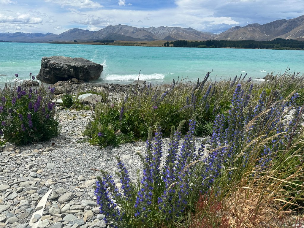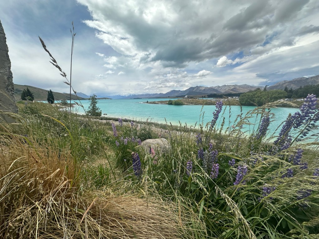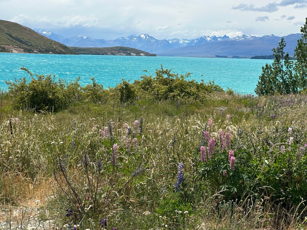 After renting a car in Christchurch, we drove three hours to Lake Tekapo. As we neared our destination, the road curved and revealed the stunning aqua/teal waters of the lake—it took my breath away. We parked at the Church of the Good Shepherd and marveled at the incredible scenery—lake, mountains, and fields of flowers. Though it was exceptionally windy, we took a walk around the lake to enjoy the views.
