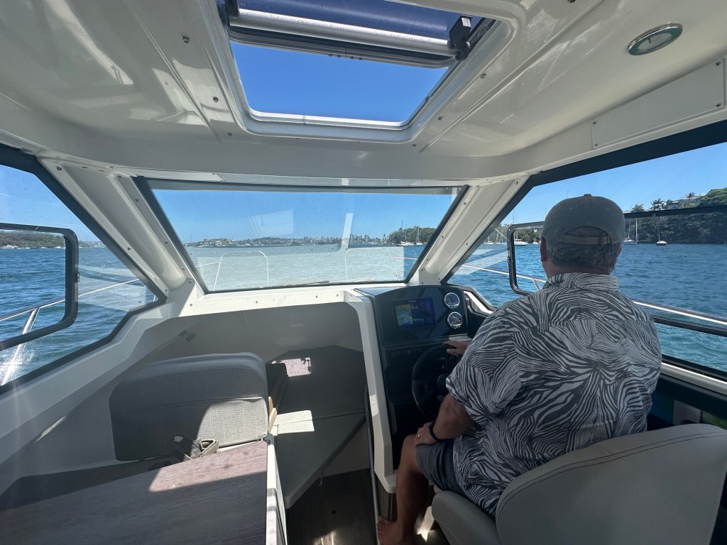 The sea was rough that afternoon, with winds exceeding 20 mph. The boat we rented was an older model with an indoor cockpit, a weird boat to drive. It reminded me of the Pontiac minivan we bought after the girls were born. We cruised past the Opera House, went under the Harbour Bridge, and ventured east toward Manly Bay.