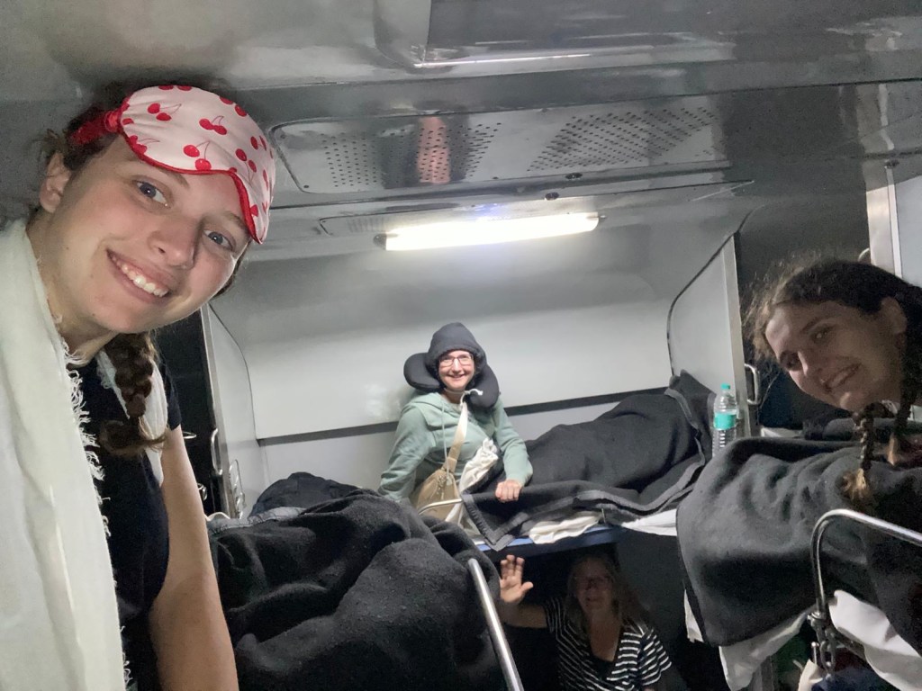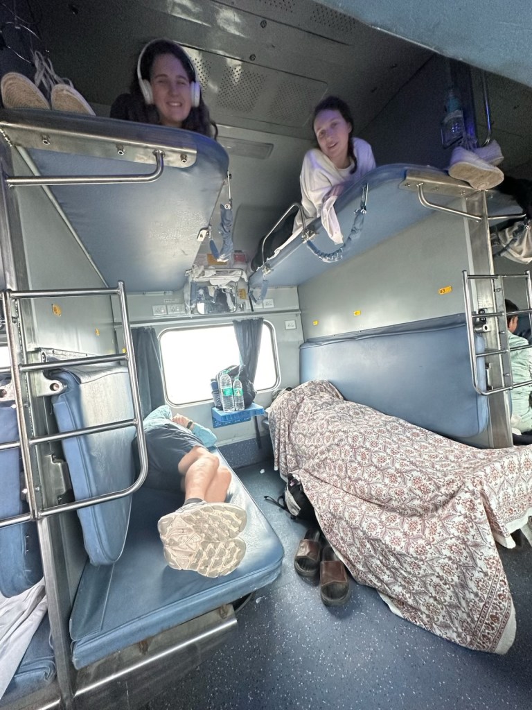 We boarded the sleeper car, with our group split between two coaches. Jane and I shared the 8 person pod with Aaliyah, Charlotte, Sally, and Manu. As we settled in, the ladies had a “giggle party” at every element of the onboarding (pad-locking our suitcases, making the beds with the sheets they provided, climbing into our cots, fellow passengers’ noises). Shortly after boarding, we learned the train was delayed again—apparently because someone was on the roof and had to be removed. We finally pulled out of Jhansi Station at 11:40 p.m.