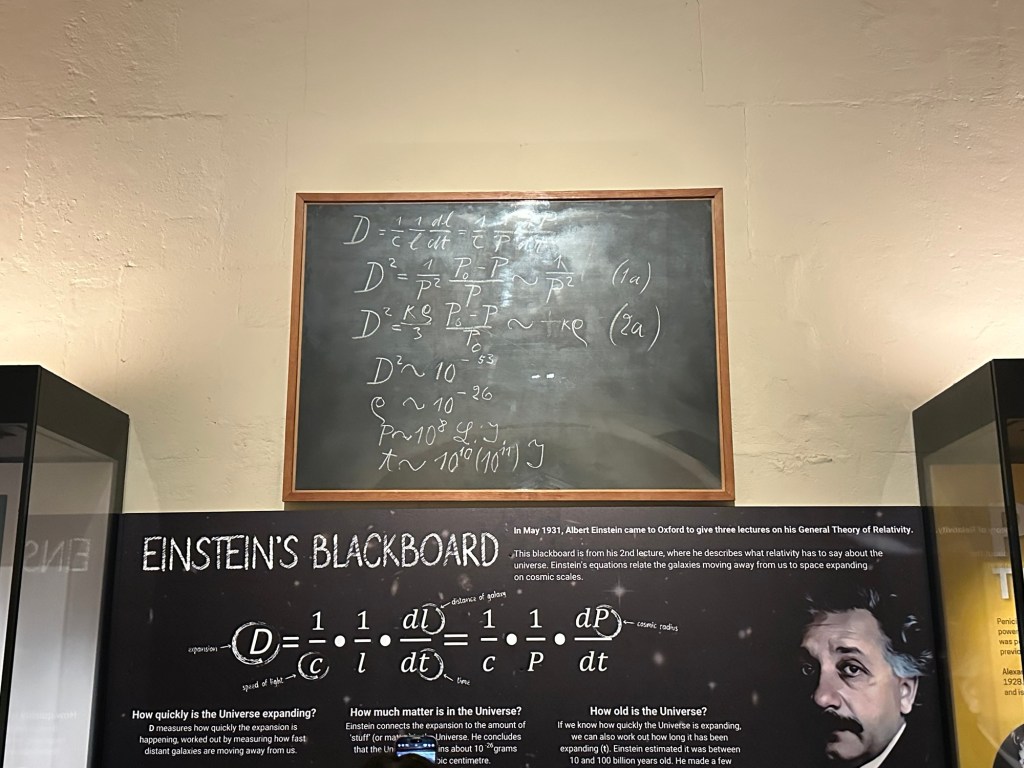 We arrived at our hotel in Oxford around 9:30 a.m., dropped off our luggage, and grabbed breakfast. At 11:00, we joined a two-hour walking tour led by a University of Oxford student studying Mathematics and Philosophy. He explained the admissions process and the structure of the different colleges. Much of our walk was in the rain. Afterward, we visited the History of Science Museum, whose most famous exhibit is a blackboard Einstein used during a 1930s lecture at Oxford. Our guide told us that after the lecture, several blackboards were saved, but one evening a cleaning woman, unaware of their importance started erasing them. Thankfully, someone stopped her before she reached the last one, which is now preserved behind glass.
