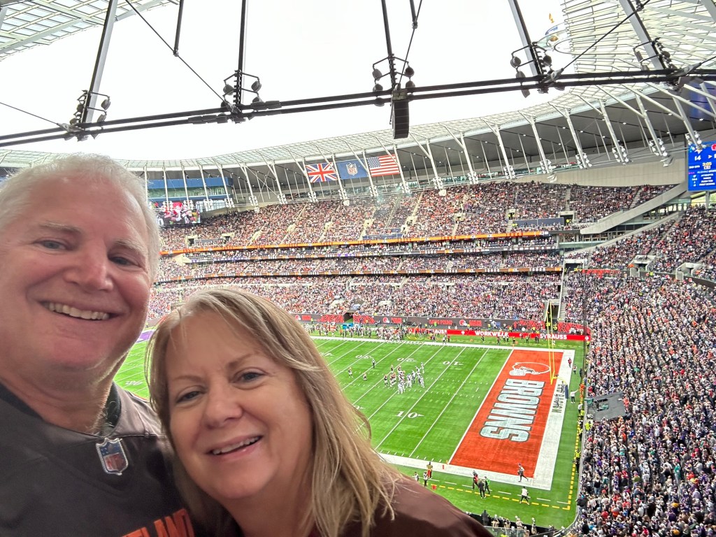 Sunday morning, after breakfast, we set out for Tottenham Hotspur Stadium to watch the Cleveland Browns vs. Minnesota Vikings. We took a bus, then the Tube, and arrived a couple of hours before kickoff. The streets were closed off, so we grabbed beers and soaked up the atmosphere. Viking fans outnumbered Browns fans at least 20 to 1. I guess a quarter-century of losing doesn’t build much of a fan base.