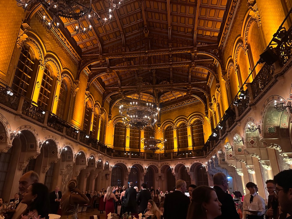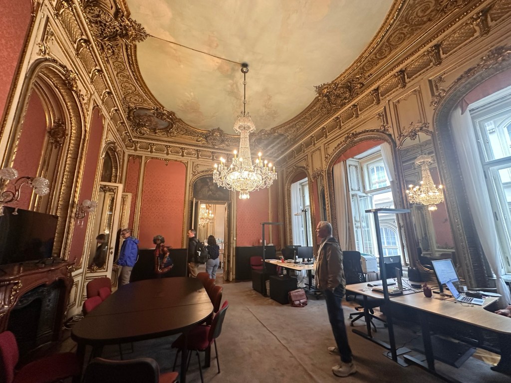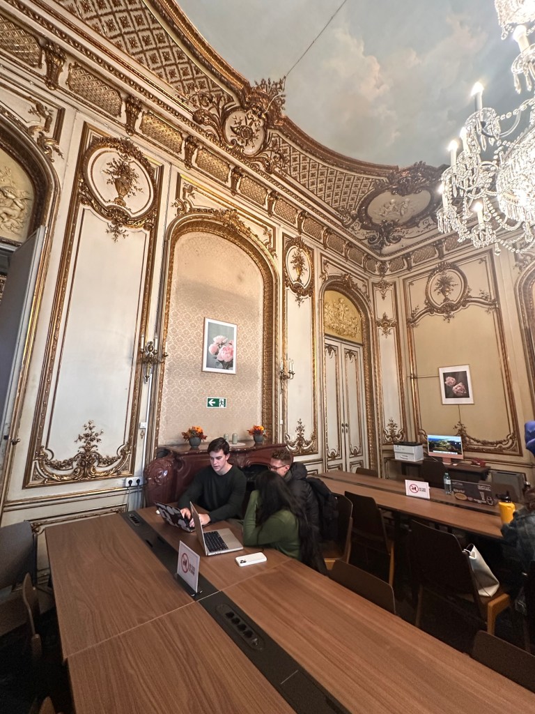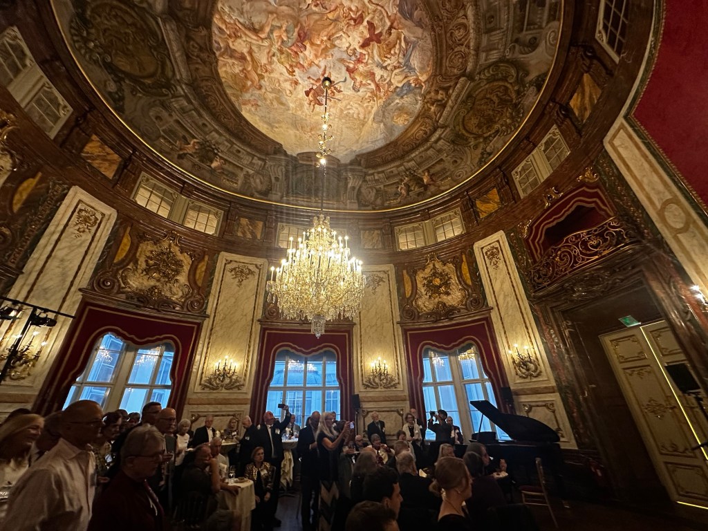 The following morning brought a tour of IES’s current home, the magnificent Palais Corelli, built in 1690. The program moved here in 1982—just one year after we left the previous location at Palais Kinsky. Walking through the baroque halls felt surreal. Display tables overflowed with posters, photographs, and yearbooks documenting the program’s history since 1950, and I found myself lost in the archives, searching for familiar names and faces. Hundreds of alumni and current students filled the space, creating an infectious energy of nostalgia and connection.
