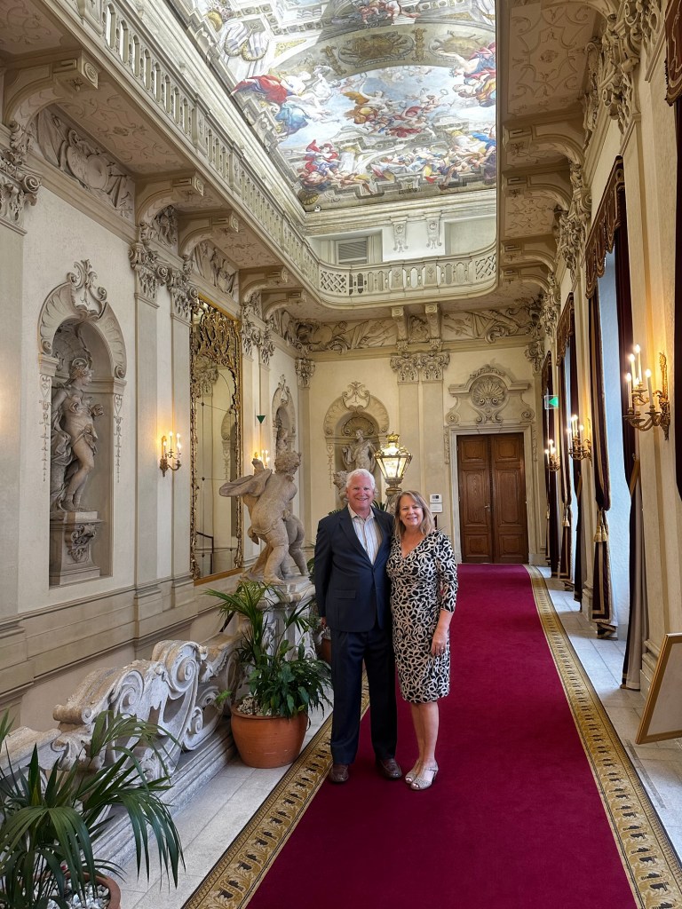 That evening’s ball at Palais Ferstel felt like stepping into a fairy tale with shared excitement. Current IES students performed a formal waltz demonstration, then opened the floor. Darryl and I joined in, spinning across the marble floor. The program honored longtime faculty, and I couldn’t believe Frau Bensch, my Baroque art history professor, now 95 years old was even there. Later, the party moved downstairs where a disco and late-night buffet kept the celebration going. Dancing in that historic palace, surrounded by people whose lives had been shaped by the same program, felt magical.