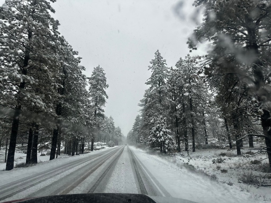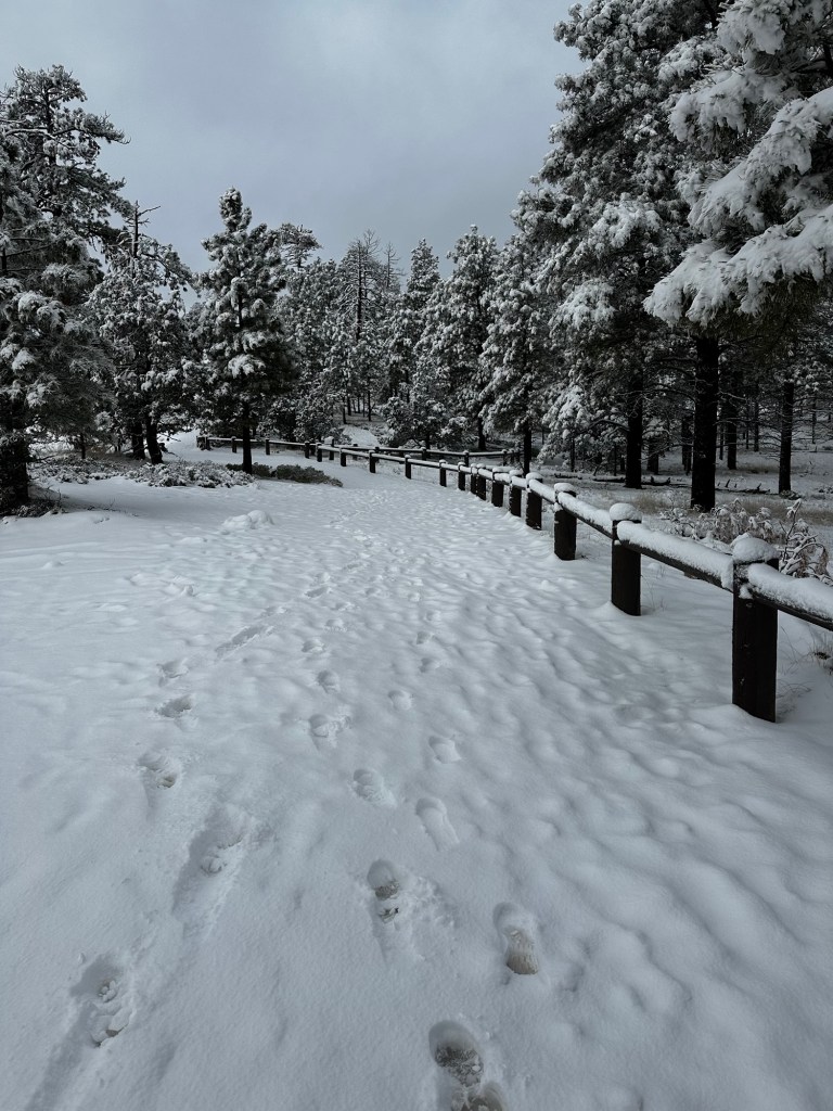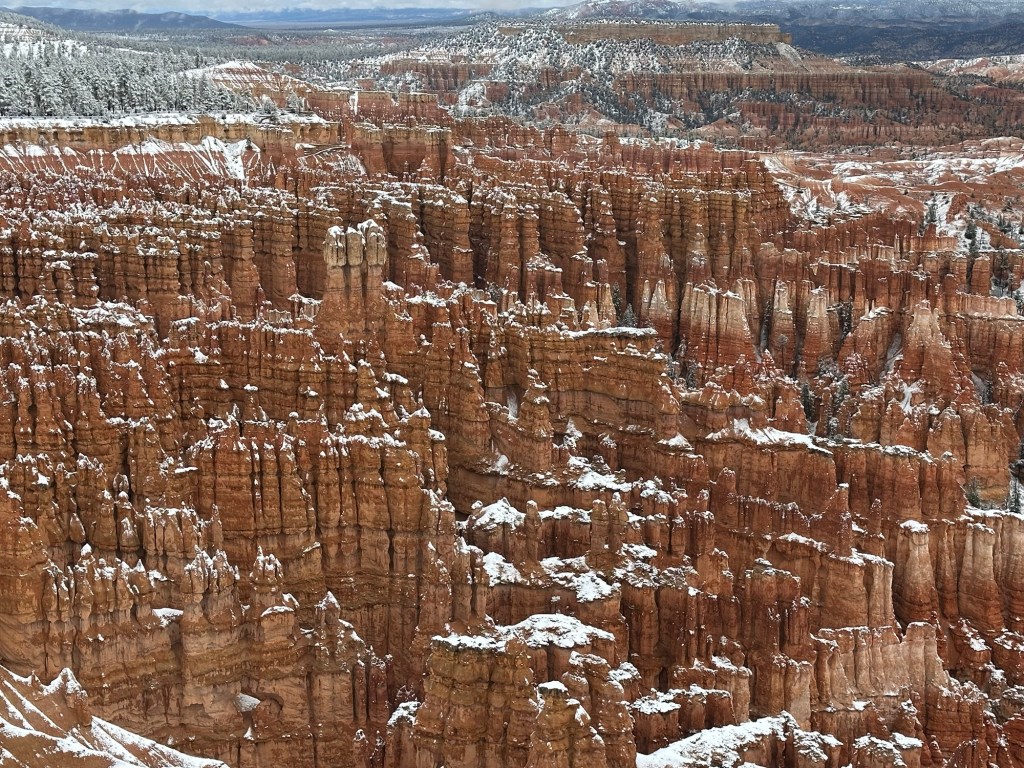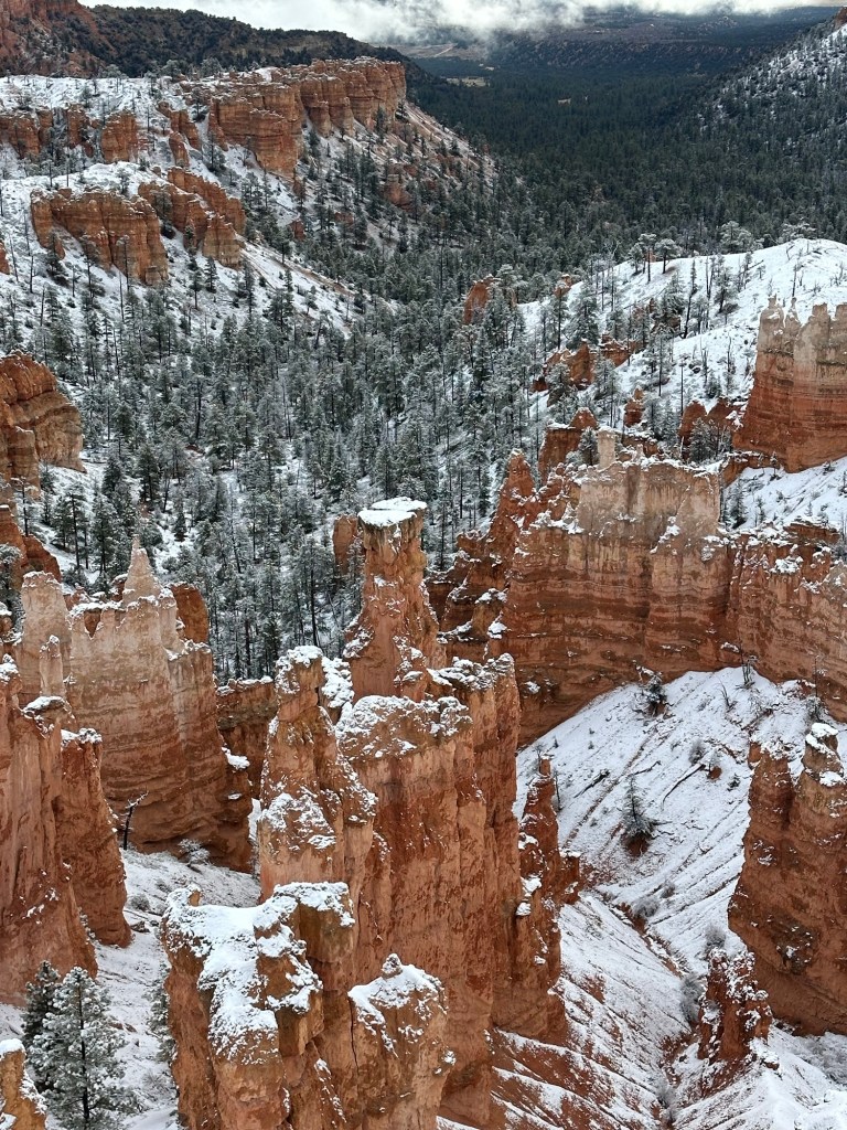 The tops of the hoodoos – those tall, thin spires of rock shaped by erosion – were dusted with snow. Hoodoos form when softer rock is capped by harder, more resistant stone that protects the column below. Bryce Canyon has the world’s largest concentration of these formations, and the fresh snow made them even more dramatic.