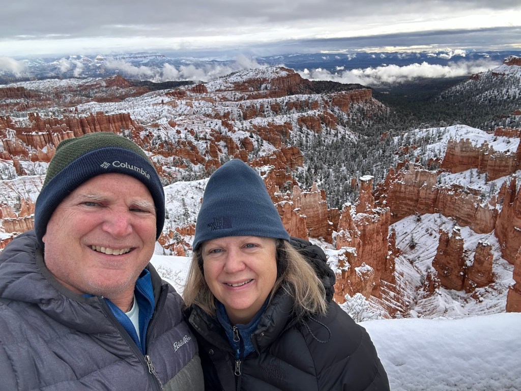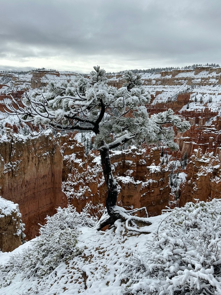 The next morning, the snow-covered trees made for a beautiful start. We drove into the park and walked the snowy Rim Trail from Sunrise Point. Because of the icy conditions, we skipped hiking down into the canyon.