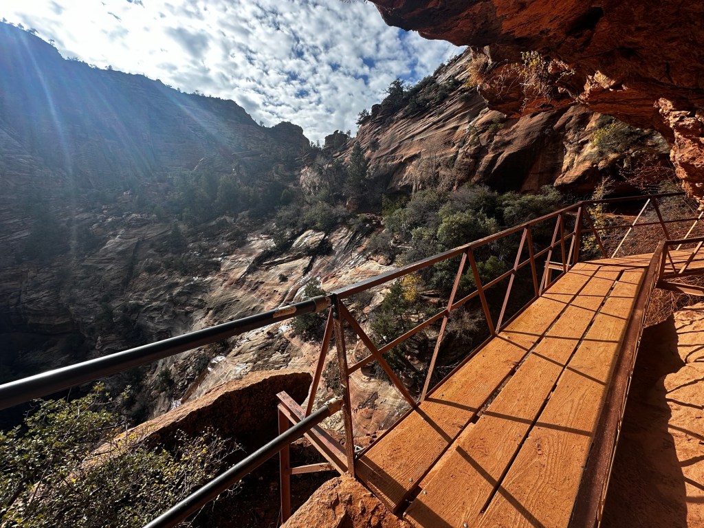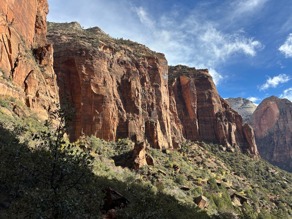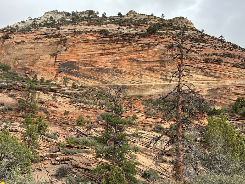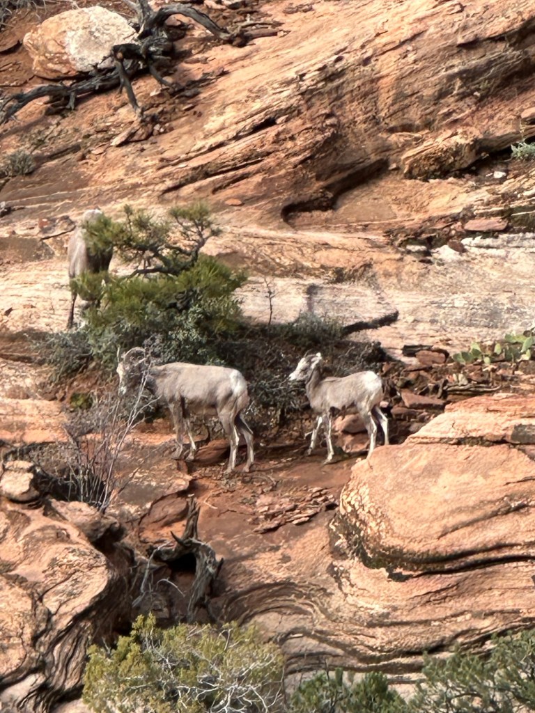 From Bryce Canyon, we drove two hours to the east entrance of Zion National Park, Utah’s first national park. The road is full of switchbacks, and we stopped to admire Checkerboard Mesa before continuing to the Canyon Overlook trailhead. Along the way we made a few roadside stops and spotted many o Desert Bighorn Sheep.