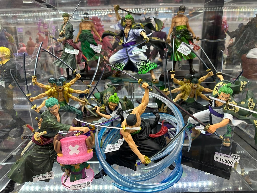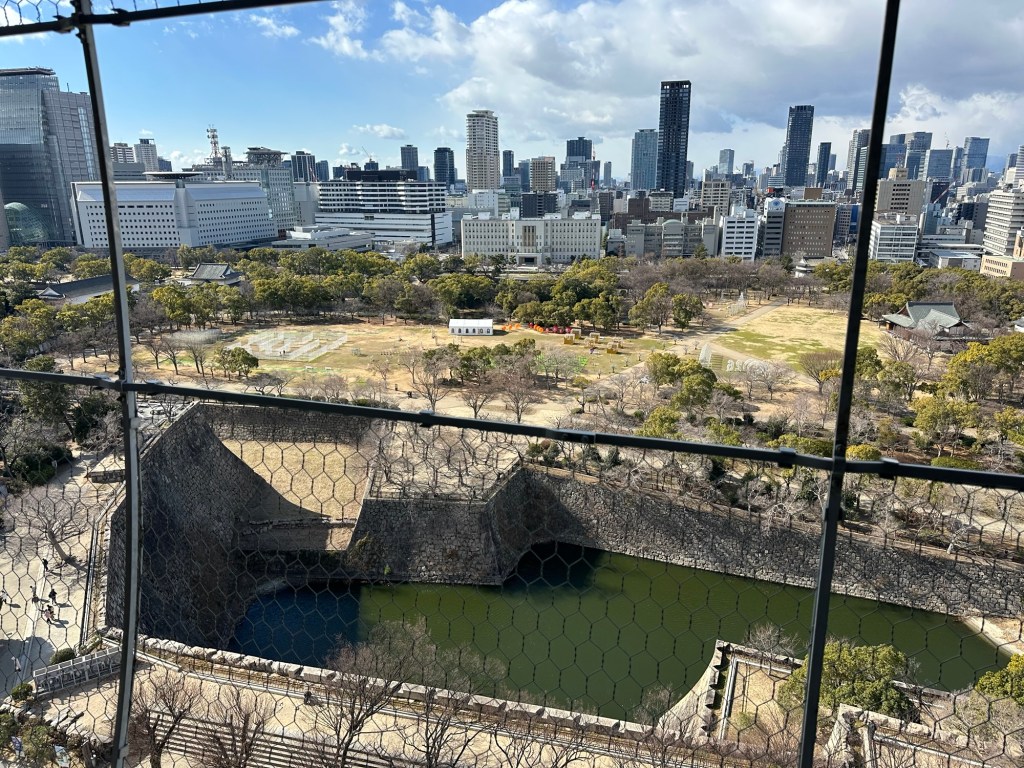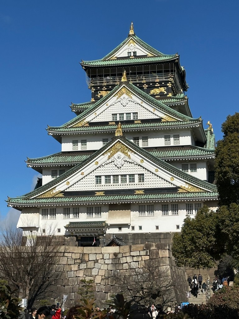 Today we visited Osaka Castle. After heading up to the eighth-floor observation deck, we walked around the surrounding park grounds. We then returned to Kuromon Market, where I had takoyaki which is golf-ball-sized dumplings made from wheat flour batter and filled with minced octopus. On the way, we encountered several streets blocked off and soon realized the Osaka Women’s Marathon was underway. Back in Namba, we wandered through local shops featuring capsule vending machine arcades, figurines, and various card stores.